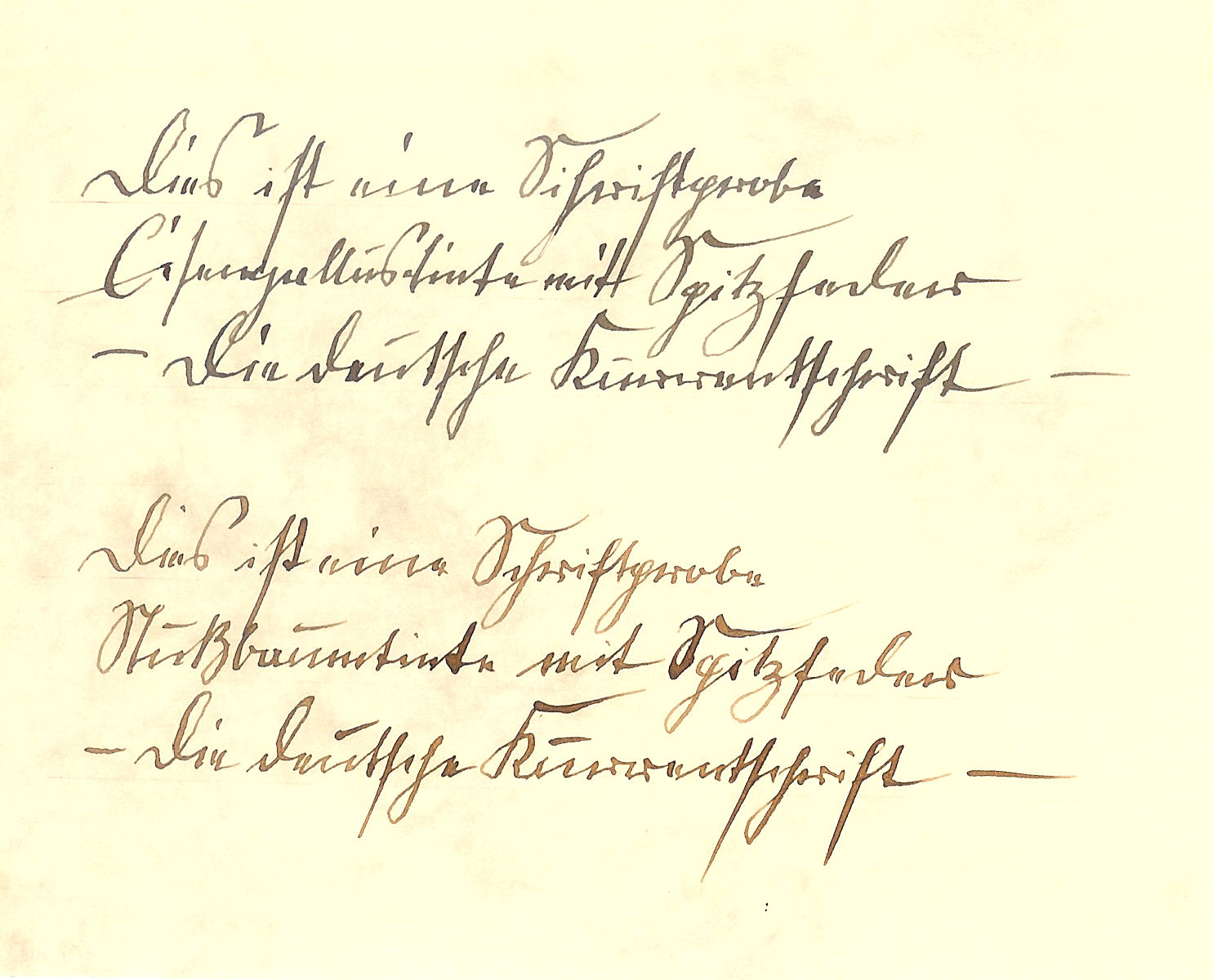 Die erste Schriftprobe wurde mit einer Eisengallustinte geschrieben. Die folgende mit Nußbaumtinte.